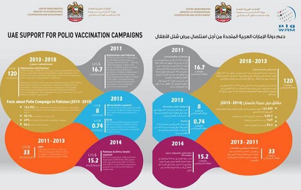 In 2014, the report indicated that the UAE provided a grant worth 55.8 million UAE dirhams (15.2 million US dollars) to the polio eradication program in Africa and Pakistan through the World Health Organization.